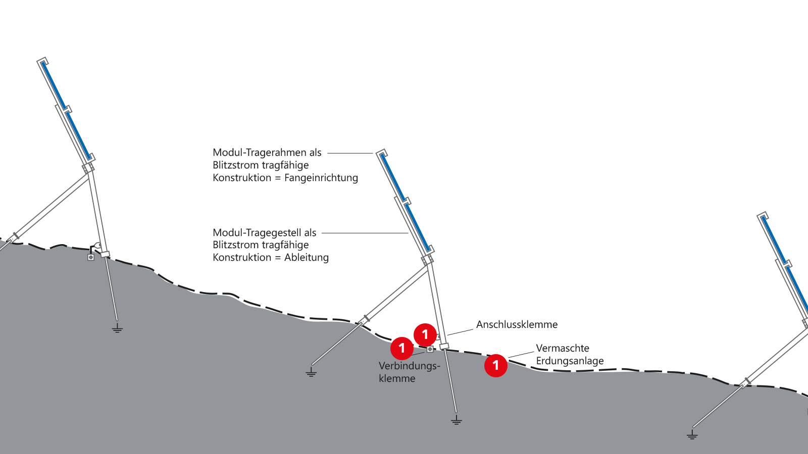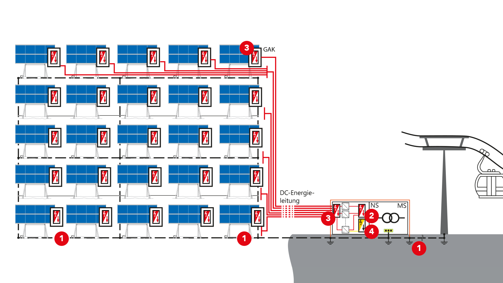 Basis für einen effektiven Blitz- und Überspannungsschutz bei großflächigen alpinen PV-Anlagen ist eine vermaschte Erdungsanlage. Sie bildet ein großes globales Erdungssystem und reduziert die Spannungsbeeinflussung der elektrischen Verbindungsleitungen bei Blitzeinwirkung erheblich. Zugleich dient sie zur sicheren Führung von Kurzschlussströmen bei evtl. auftretenden Fehlern auf der DC- oder AC-Seite bzw. der Niederpannungs- oder Hochspannungsseite.
