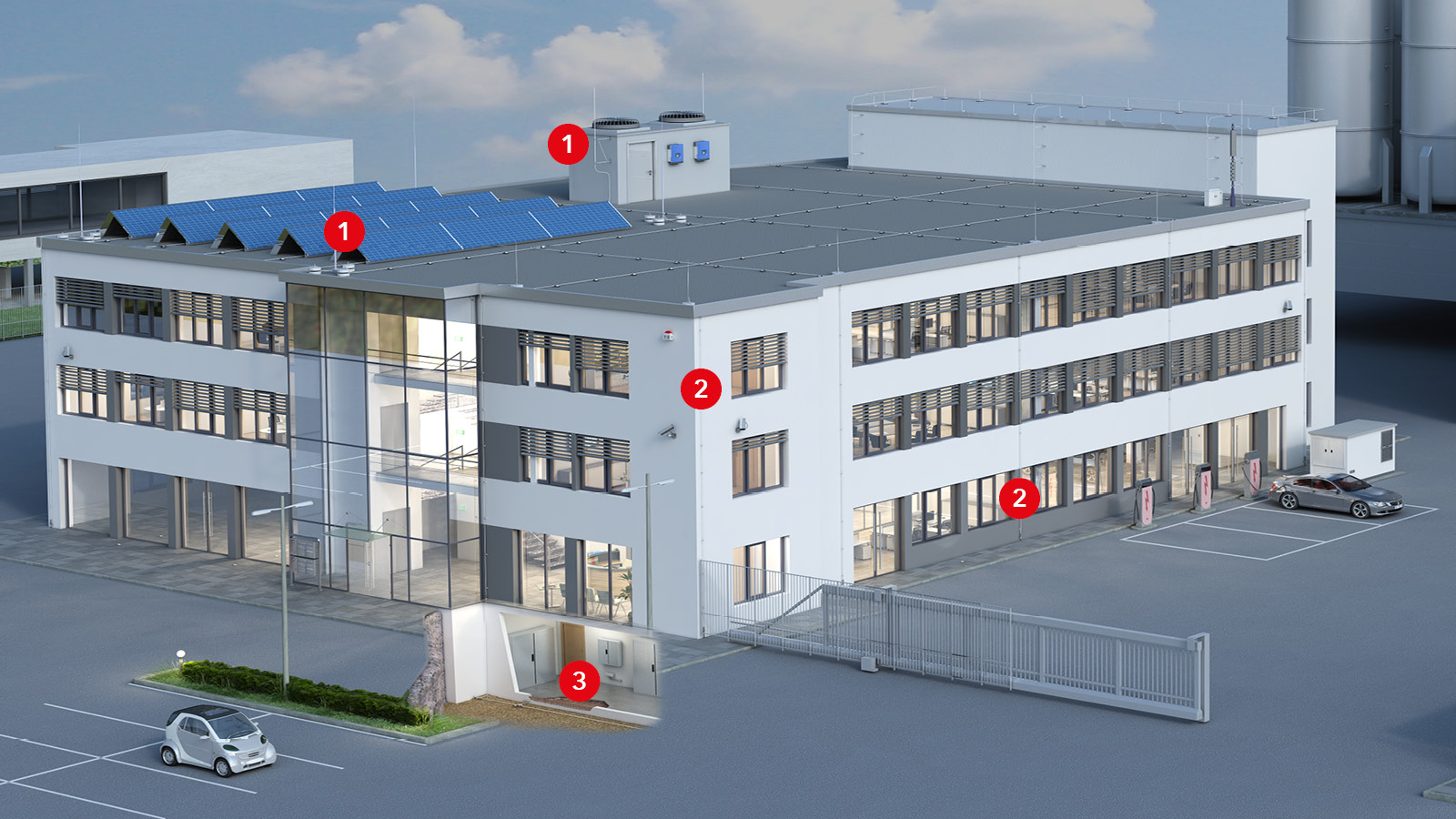 Dû aux grandes surfaces et aux structures complexes des bâtiments, un système extérieur de protection contre la foudre est particulièrement important pour les bâtiments industriels et commerciaux. Le système extérieur de protection contre la foudre protège les bâtiments et les modules photovoltaïques contre les coups de foudre directs. Les mesures nécessaires à la réalisation sont décrites dans les normes SN EN 62305-3 et SN 414022.