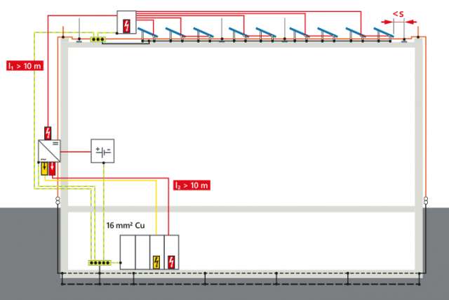 Si la distance de séparation (s) calculée conformément aux normes SN EN 62305-3 et SN 414022 ne peut pas être respectée, par ex. sur un toit en métal, il faut réaliser une liaison équipotentielle de protection contre la foudre.