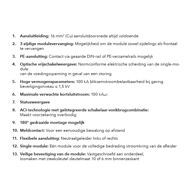 Innovatieve detailoplossingen zoals een automatische uitschakelfunctie met visuele weergave van spanningsuitval, 3-zijdige vervangingsopties voor modules of een aansluitdoorsnede van 16 mm² Cu die altijd hetzelfde is, zorgen voor maximale veiligheid.