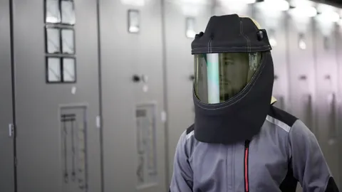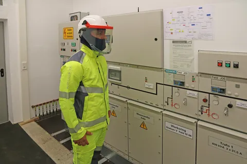 Schermi di protezione testati contro l'arco elettrico con alta trasparenza per lavorare in sicurezza negli impianti elettrici. Certificati secondo il regolamento DPI (UE) 2016/425 per la commercializzazione dei dispositivi di protezione individuale. Cappuccio di protezione per una protezione completa di viso, testa e collo. Caschi di protezione per elettricisti per l'installazione degli schermi di protezione e del cappuccio di protezione.