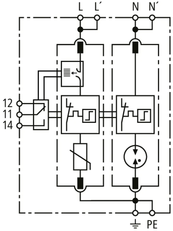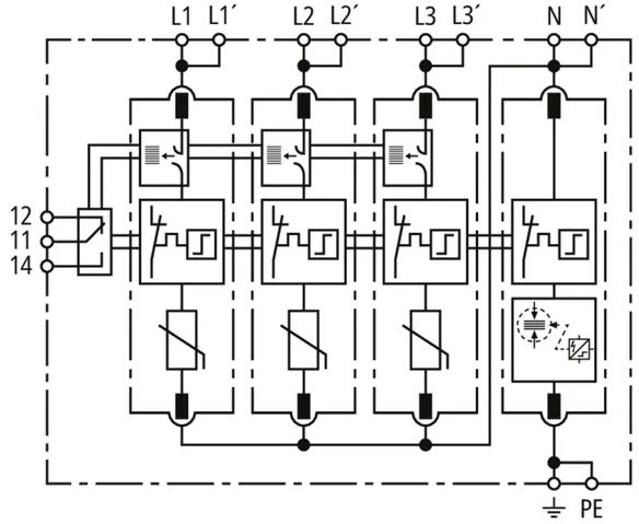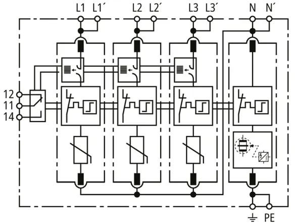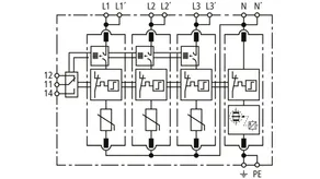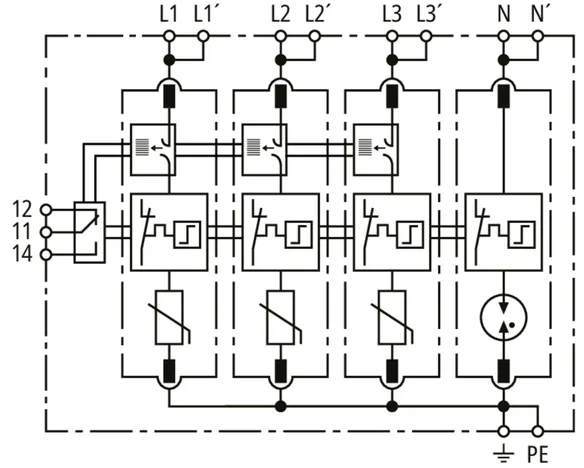 Modularer Überspannungs-Ableiter mit Advanced-Circuit Interruption (ACI) für TN-S-Systeme (4+0-Schaltung); mit potentialfreiem Fernmeldekontakt.