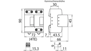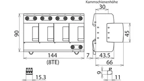 • Anschlussfertiger Kombi-Ableiter Typ 1 + Typ 2 + Typ 3 auf Funkenstreckenbasis, bestehend aus Basisteil und einem einzelnen gesteckten Schutzmodul