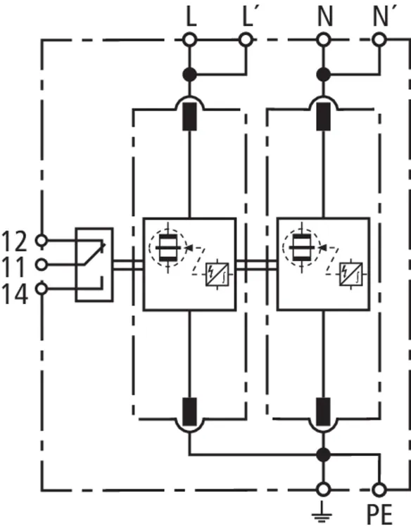 Modular combined lightning current and surge arrester for single-phase TN systems with a nominal voltage of 230 V (2+0 configuration); FM version with floating remote signalling contact.