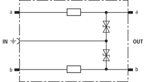 Protective plug (one pair), energy-coordinated with DRL plug-in SPD block, for use as single-stage protective device for terminal equipment with decoupling impedances. Ideally suited for signal circuits sharing a common reference potential. Earthing via EF 10 DRL. For disconnection blocks or DRL plug-in SPD blocks only.