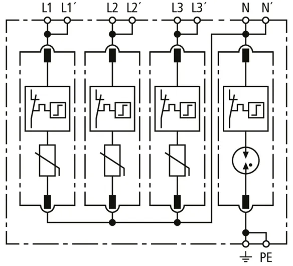 Modular surge arrester for use in TN-S systems (4+0 configuration); with floating remote signalling contact.