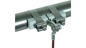 Up until now, connections for the equipotential bonding and the lightning equipotential bonding in hazardous areas have often been welded or made with threaded bushings. The use of clamps is only approved if ignition safety in the event of lightning currents has been proven. DEHN has provided proof of the non-ignition of the pipe clamps during lightning current loads. By implementing the test according to EN 62561-1 (VDE 0185-561-1): requirements for connecting components (terminals and connectors) in an explosive atmosphere, the non-ignition of the specimen under a lightning current load of up to 50 kA (10/350 µs) was proven. The design of this novel, patented pipe clamp for the hazardous area firstly includes safe electrical contact through two contact clips, and secondly mechanical fixing through an electrically insulated clamp body in each case. The mounting set (part. no. 540902), available separately, is required once for the correct pretensioning of the tensioning strap.