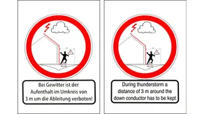 Information sign: Touch and step voltage Information sign about touch and step voltages due to risk of touch and step voltages for living beings as required in DIN EN 62305-3 (VDE 0185-305-3) Bilingual version (front German / back English).