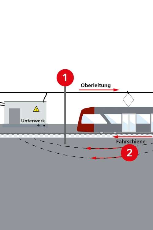 2 Über die Rückleitung (Fahrschiene) fließt der Strom wieder zurück zum Unterwerk. Die Fahrschienen bilden die Bahnerde: leitfähig und geerdet dienen Sie der Rückleitung des Fahrstromes (Rückstromführung).