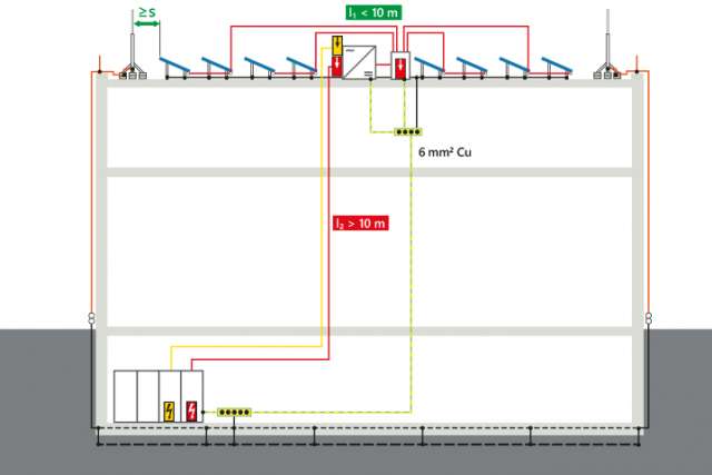 Veuillez noter : Les normes SN EN 62305-3 et SN 414022 décrivent les mesures de protection pour les installations d’alimentation électrique photovoltaïques. Pour les bâtiments avec protection extérieure contre la foudre, les normes distinguent entre les cas suivants :