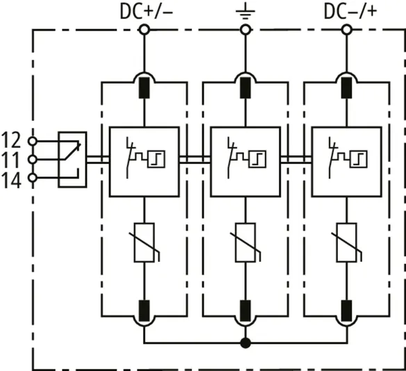 Mehrpoliger, modularer Überspannungs-Ableiter für PV-Anlagen mit Fernmeldekontakt für Überwachungseinrichtung (potentialfreier Wechsler).