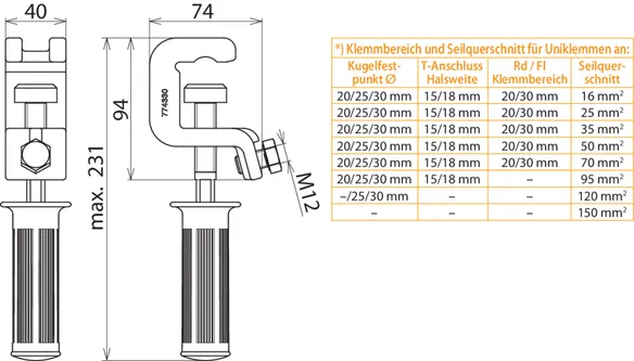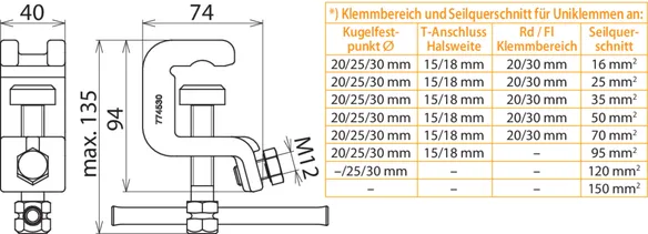 | *) siehe Tabelle Klemmbereich und max. Seilquerschnitt für Universalklemmen | |