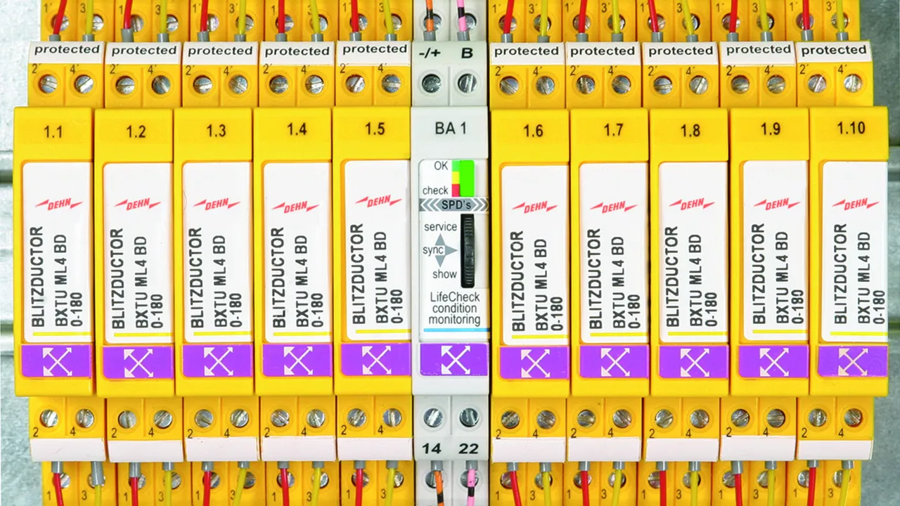 DIN rail mounted device with integrated RFID LifeCheck sensor for condition monitoring of max. 10 BLITZDUCTOR XT / XTU arresters with RFID LifeCheck technology. Visual operating state indication via three-coloured LED in conjunction with remote signalling contact (break or make contact).