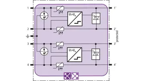 Space-saving combined lightning current and surge arrester module with actiVsense technology and RFID LifeCheck for protecting two pairs (same or different operating voltage) of balanced interfaces with galvanic isolation. Automatically detects the operating voltage of the useful signal and optimally adapts the voltage protection level to it.