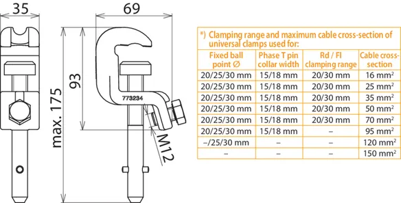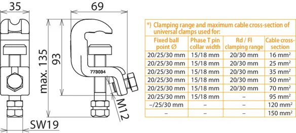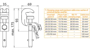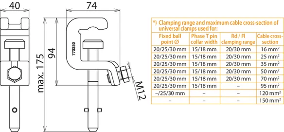 *) See table for „Clamping range and maximum cable cross-section of universal clamps used for“