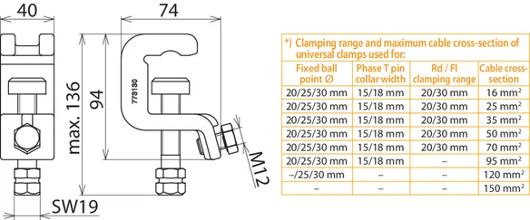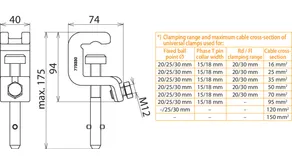 *) See table for „Clamping range and maximum cable cross-section of universal clamps used for"